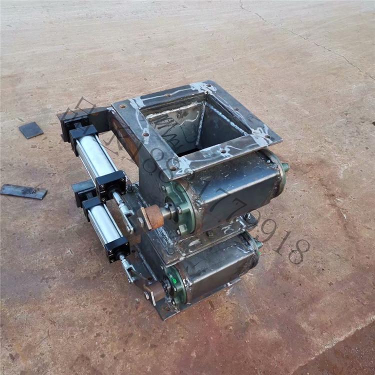 雙層重錘翻板閥的閥板在物料重力作用下自動開啟,物料下落后,配重杠桿系統使閥板自動復位,防止野風吹入,從而完成物料的輸送。